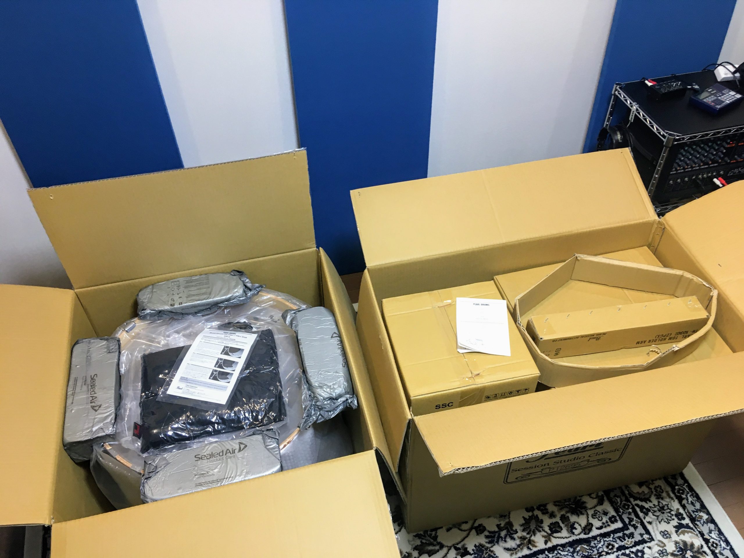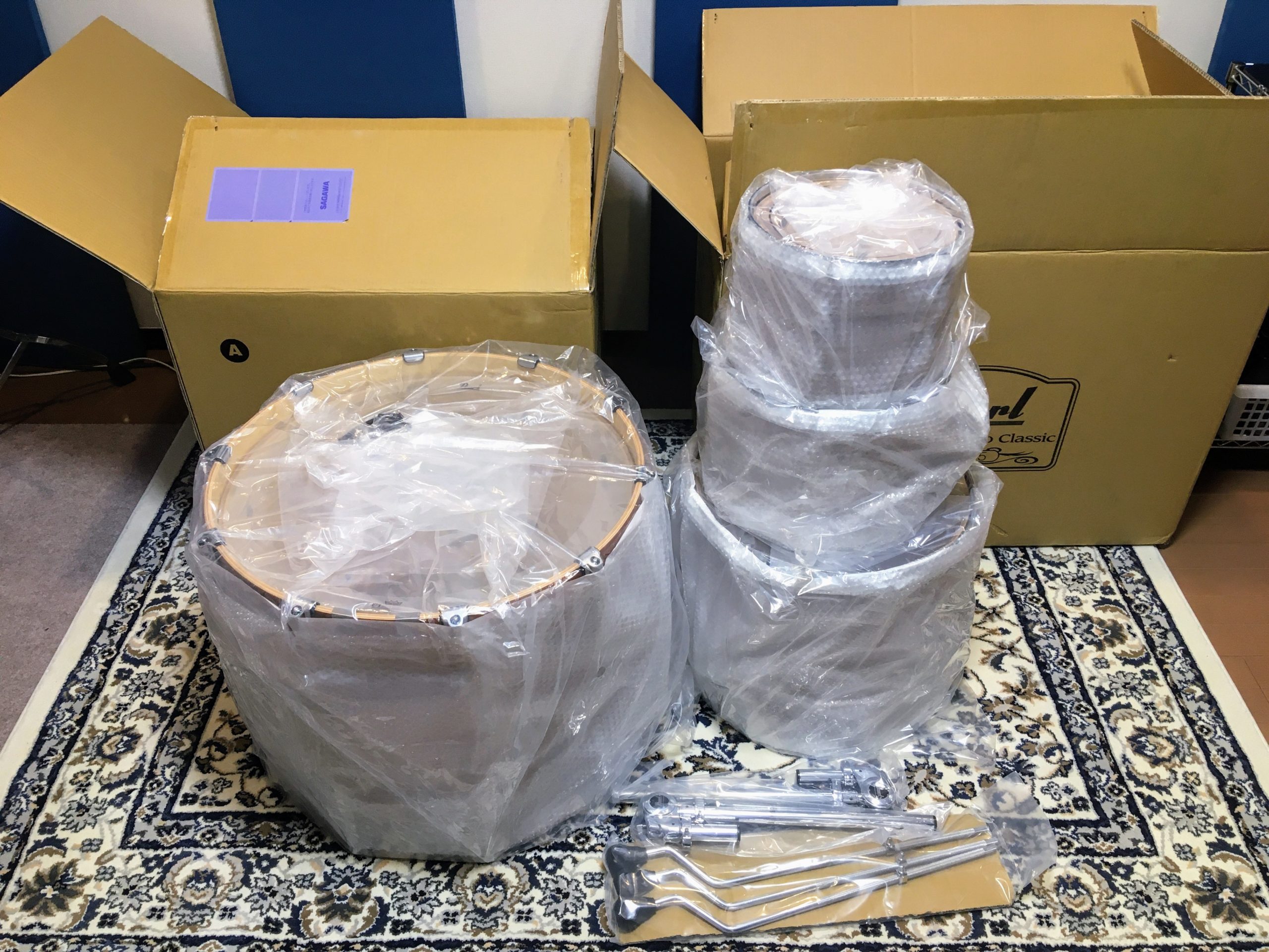 左の箱にはバスドラ、右の箱にはタム2個とフロアタムがそれぞれ箱に入っています。