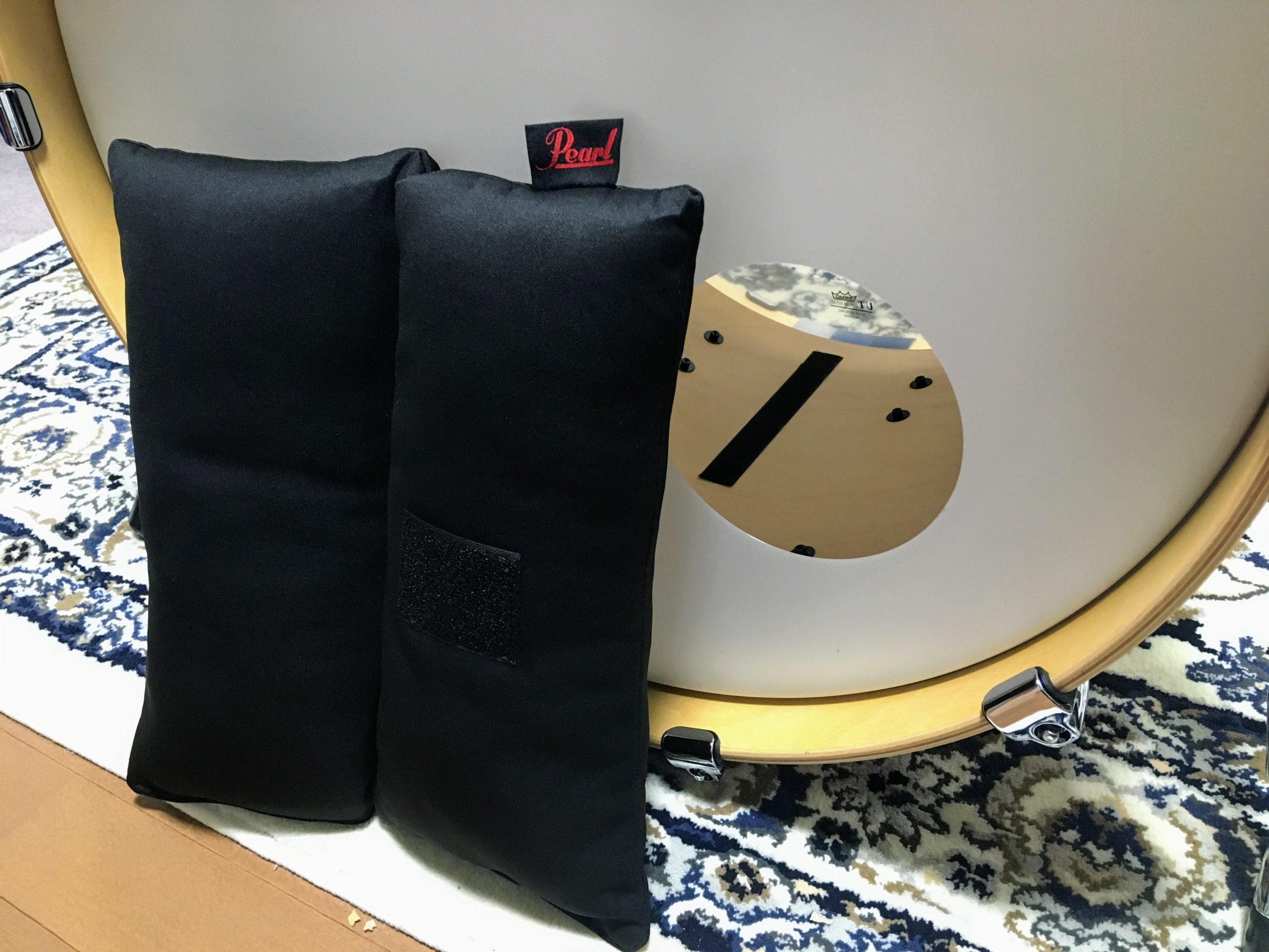 このクッションをバスドラム内の打面側に少し接触する状態でセットする事でサスティーン(音の伸び)がカットされ、ドーン!という音からドン!という短い音になります。